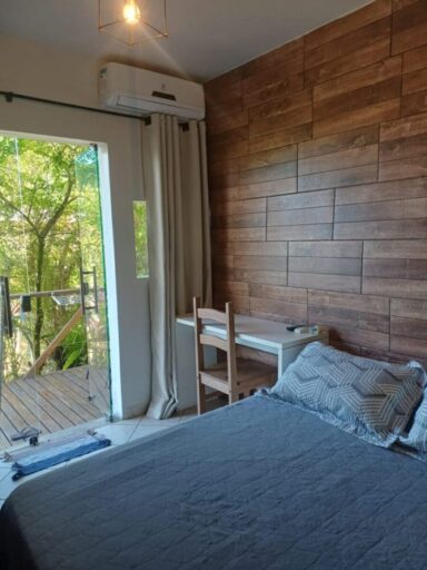 Essa acomodação fica no piso térreo, e conta com cama de casal, iluminação aconchegante , banheiro privativo de pedras, ar condicionado e Sky. É possível adicionar uma cama de solteiro extra. Consulte condições! Tem uma mini cozinha externa com frigobar, microondas, cafeteira e sanduicheira,pia e utensílios básicos de cozinha. Possui varanda.…